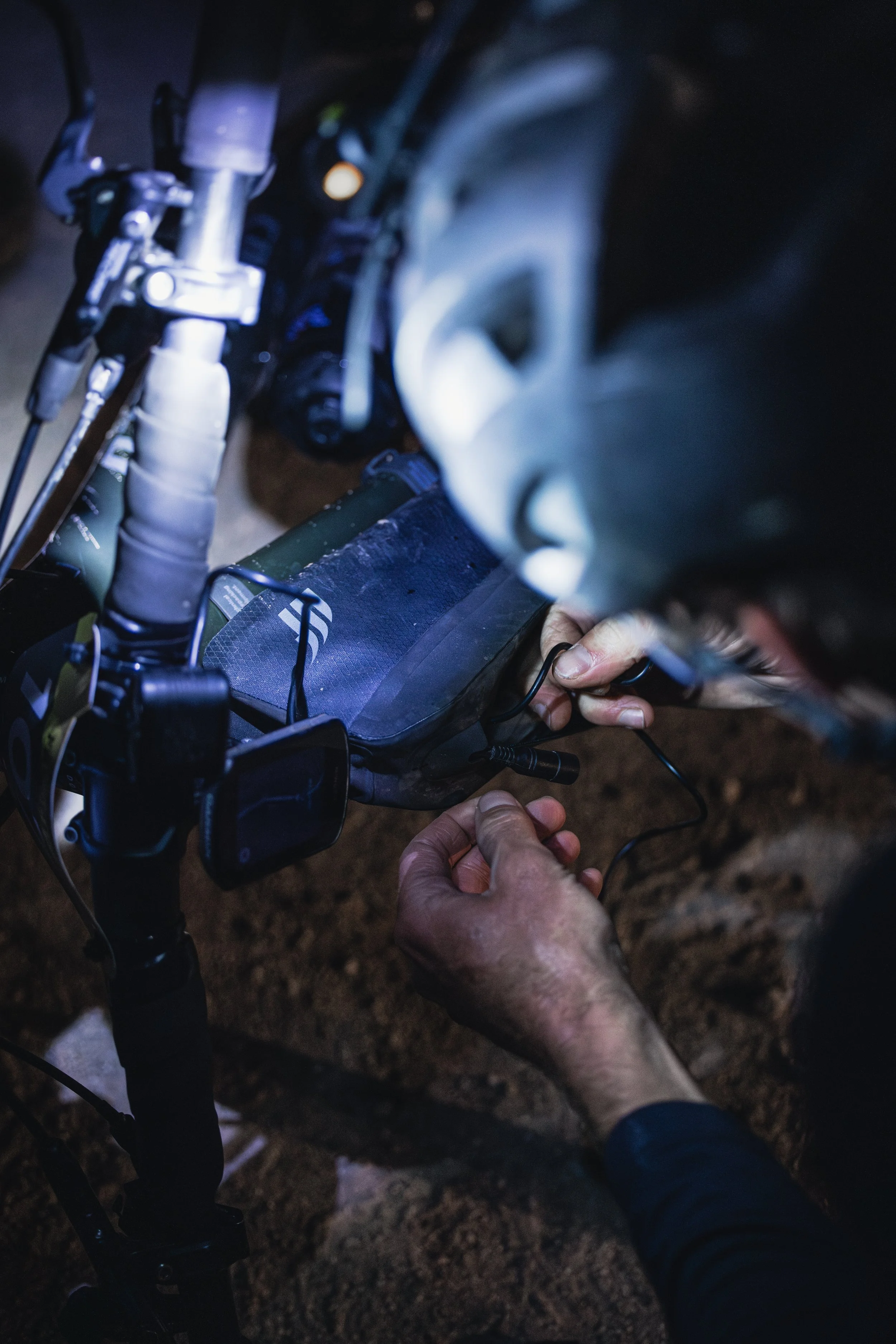 As a morning person, the 10 p.m. start is one of the most challenging parts of Vapor. Luckily, I ran into my old buddy Eric on the rollout from town, so the first couple of hours flew by. About 15 miles in, we hit some faster sections of trail, so I reached down to click on my handlebar light. Clicked the button, nothing. Clicked it again, still nothing. Click, click, click, nada.